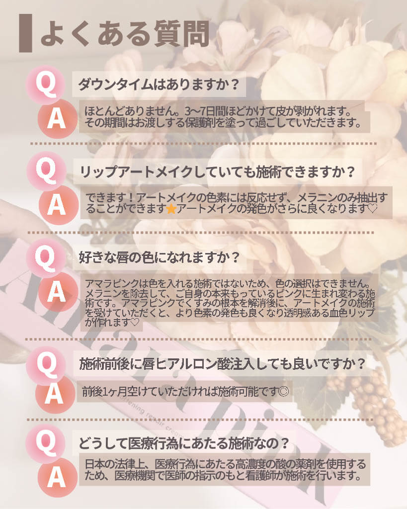 - また、施術時の衛生管理が不十分な場合、細菌感染やウイルス感染(口唇ヘルペスなど)のリスクもゼロではありません。